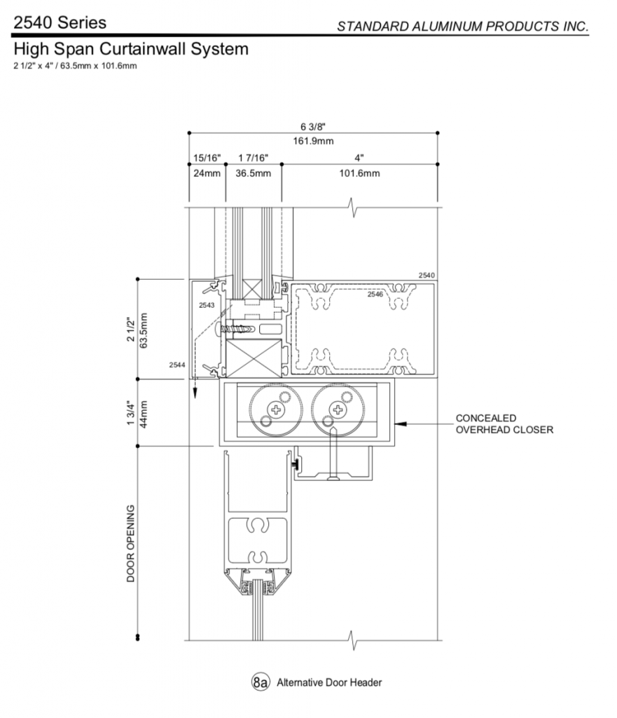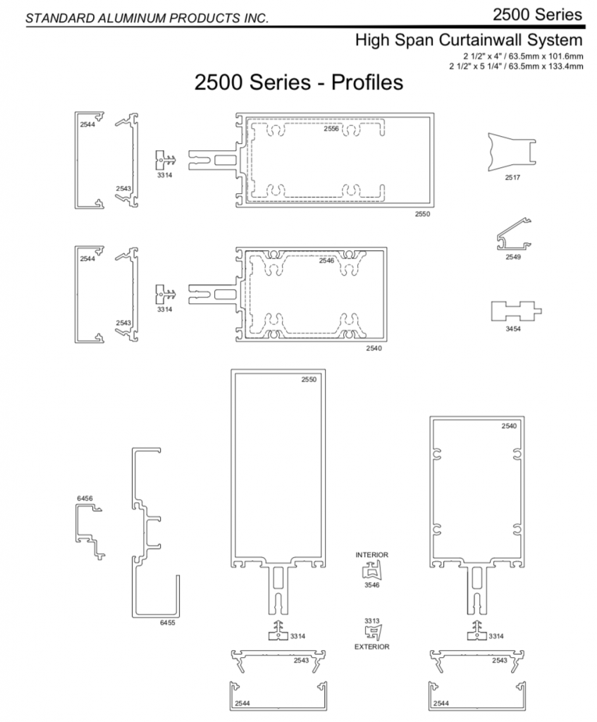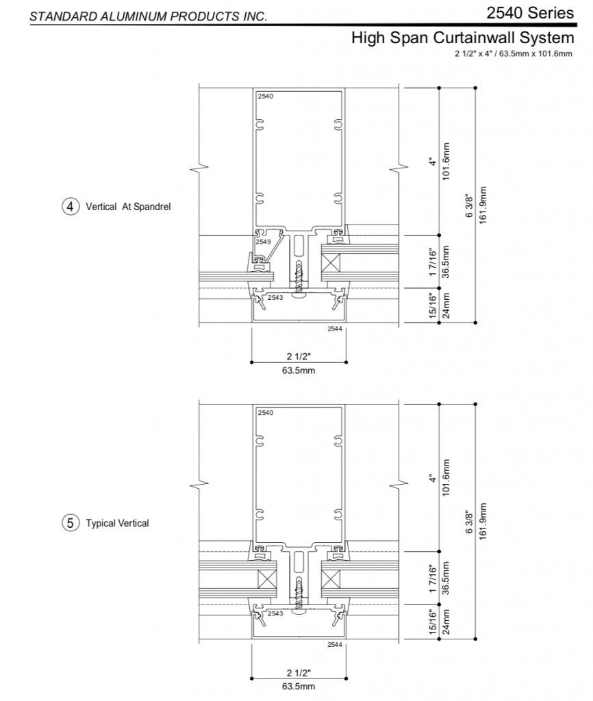 A high performance 21/2″x4″or21/2″x5 1/4″ flexible system for use as a multi-storey pressure capped curtain wall. Stick system with shear block construction or unitized system with screw port construction. Features include thermally broken, split colour and door adapters for any Standard Aluminum door.