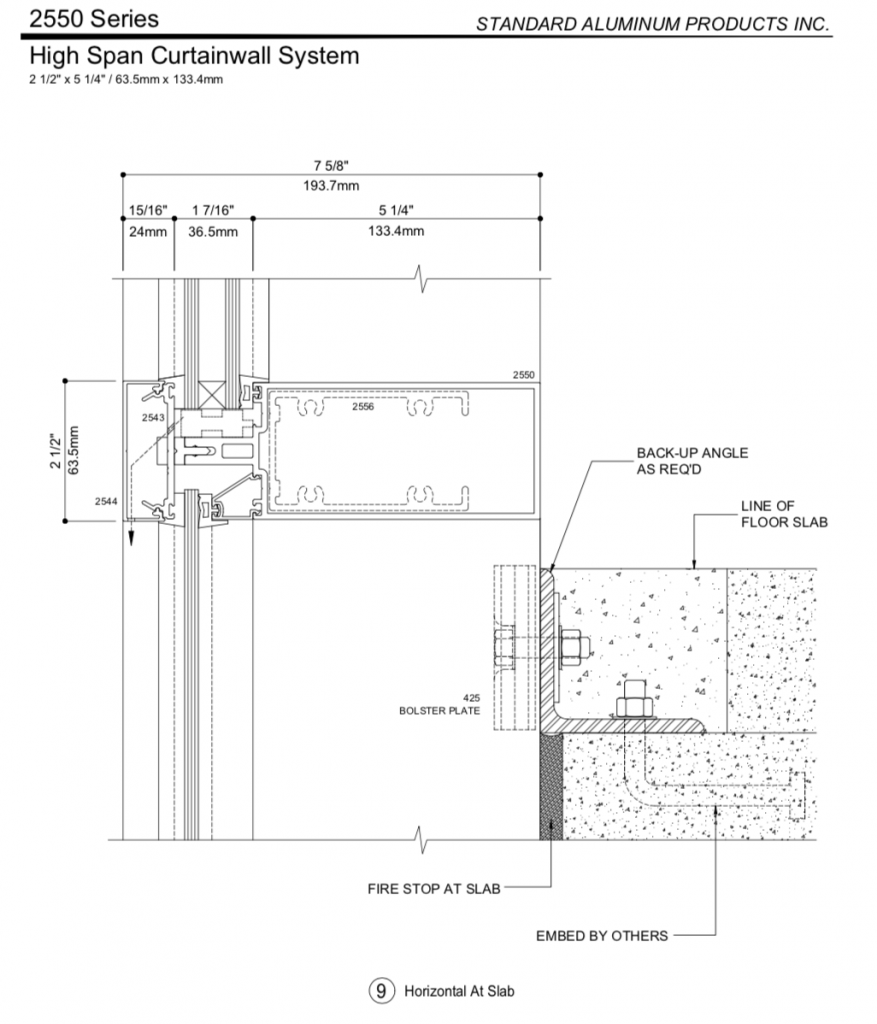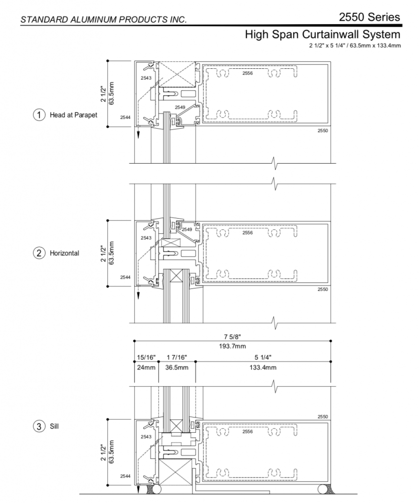 A high performance 21/2″x4″or21/2″x5 1/4″ flexible system for use as a multi-storey pressure capped curtain wall. Stick system with shear block construction or unitized system with screw port construction. Features include thermally broken, split colour and door adapters for any Standard Aluminum door.