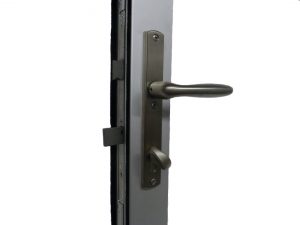 Simultaneously extending the stainless steel hex bolts top and bottom and pivoting the massive MS bolt into the mating door’s stile, the three-point lock secures the entire double door entrance.