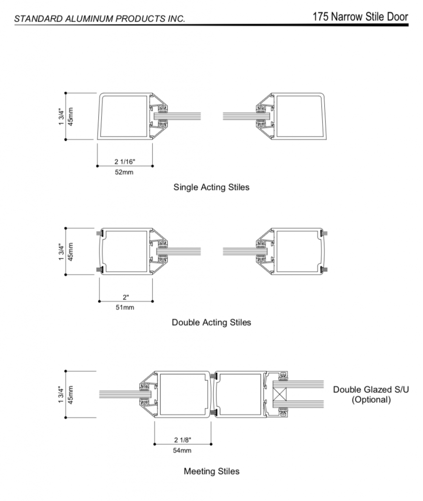 All doors have snap in glass setting blocks for either single or double glass. M.S. hook lock b.s. is 1.125 inches to give maximum clearance from door framing material. All horizontal sections are extruded 0.03 narrower than vertical sections to assure not only an accurate fit but a clean joint, free of unsightly saw cut lines.