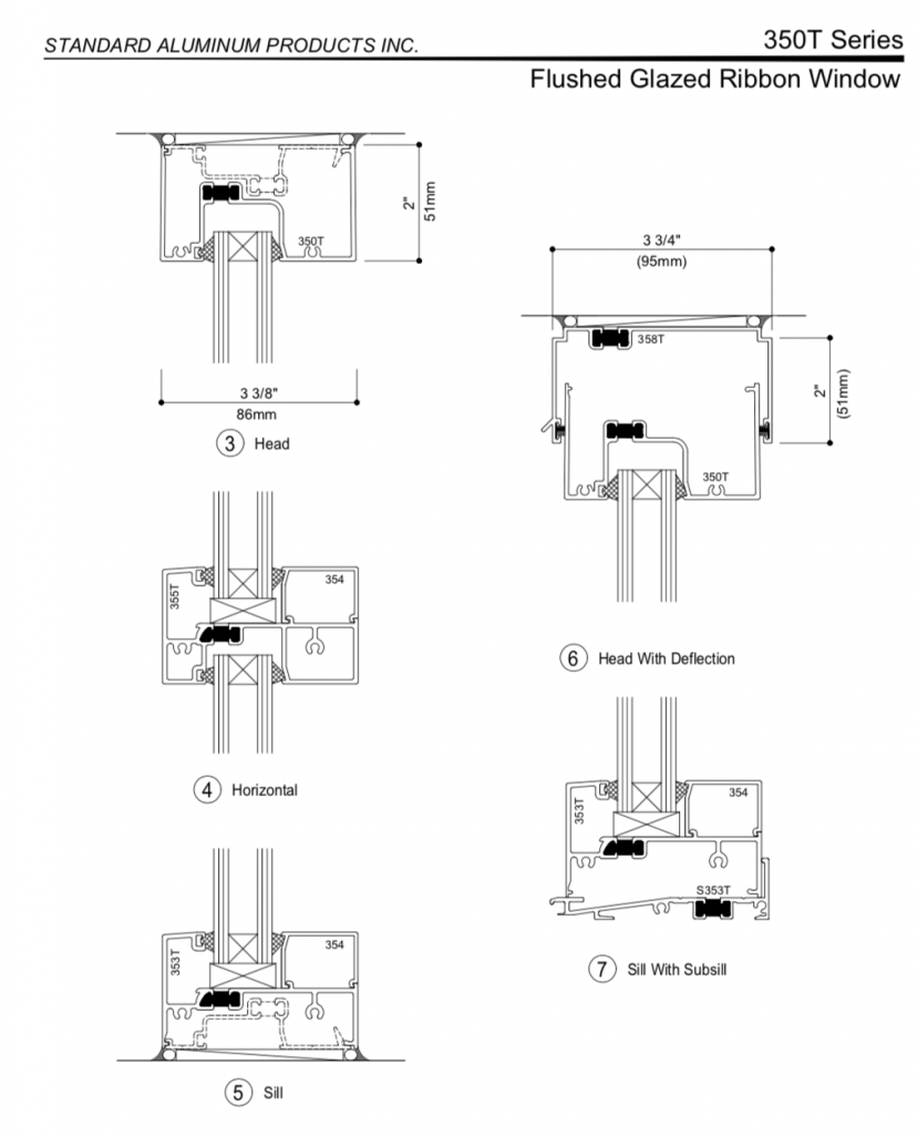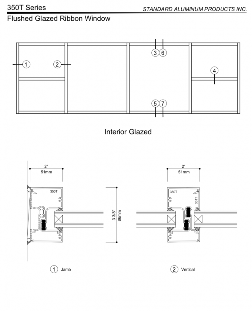 The 350T series is 3 3/8″ x 2″ with the glass offset to the front of the frame. The window is available in thermally broken or non-thermally broken framing. The split mullion design with screw spline corner connections can be used as a storefront system. The offset glass position eliminates all frame shadow lines from the glass surface.